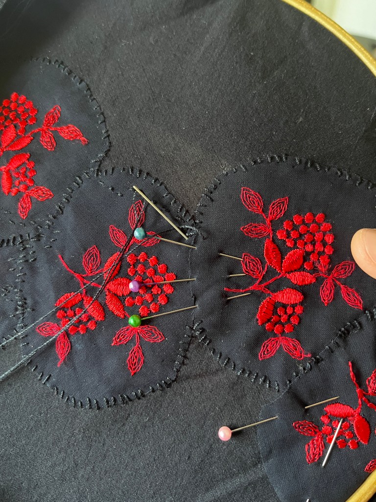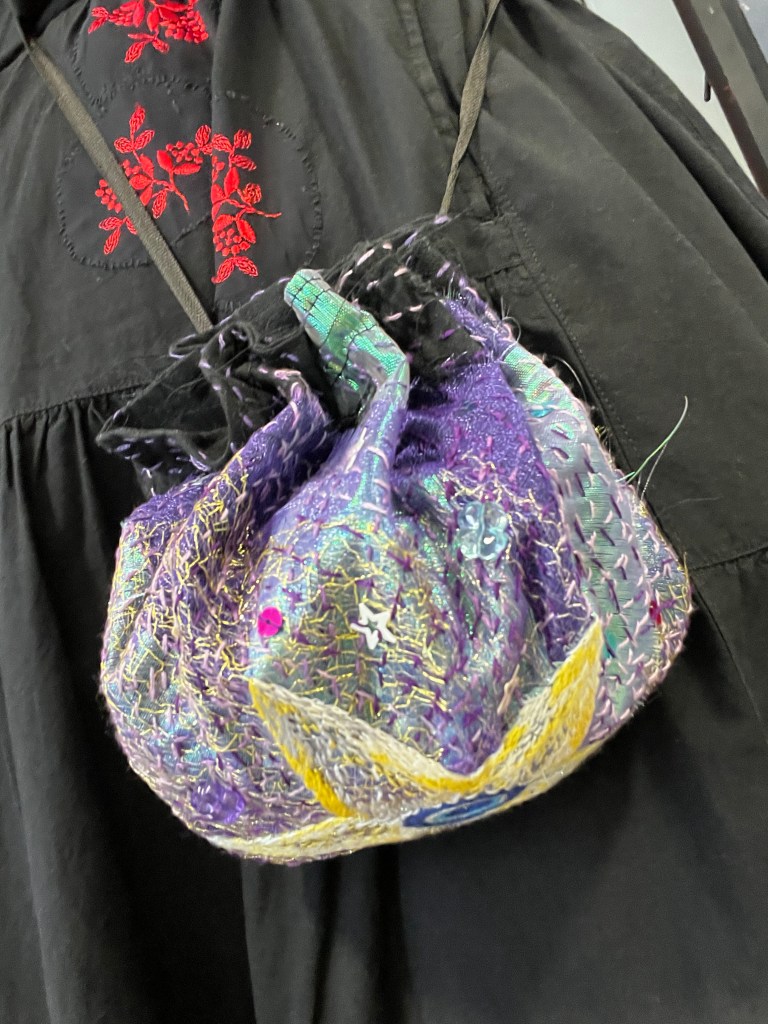 The first is a simple circle draw-string pouch, and the second is an 18th-century pocket pouch. I used the same techniques as for the witch hat, but I added a bit more embroidery to the draw-string pouch.