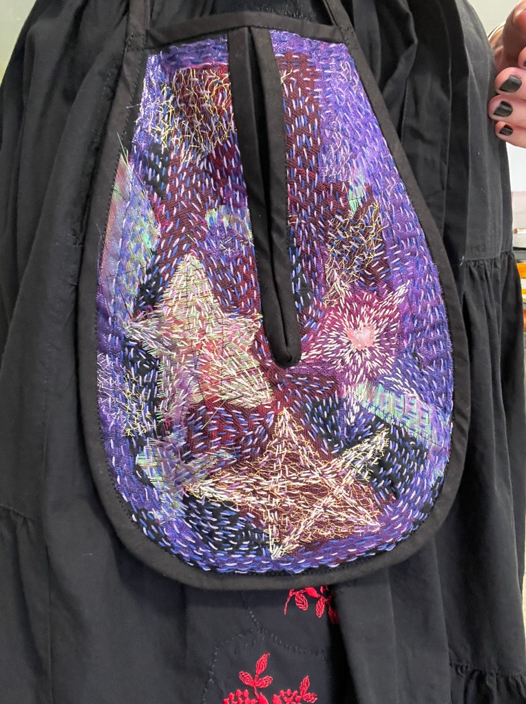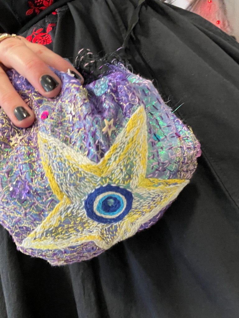 I created my ridiculously tall witch hat by adapting a bucket hat pattern. I layered organza and other funky fabric I had lying around and used sashiko-style stitches to attach the various pieces and add even more decoration.