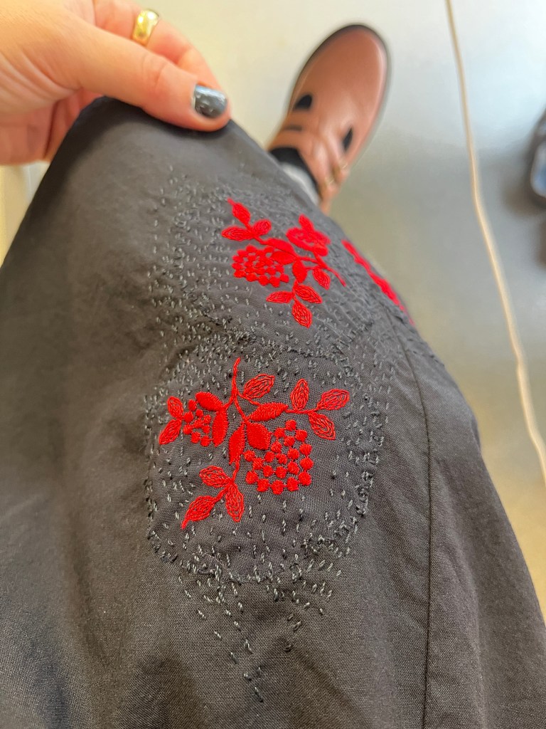 I had two Uniqlo dresses, both a size too small. I undid the seams of one and cut a panel out of the other to create a dress that fits. I widened the armholes and added red bias binding to finish the edges. I had found a thin black scarf with red lace and embroidery which I cut up and appliquéd to the dress. I also added a gathered part of the scarf as an extra layer to part of the bottom tier of the dress. I added ruffles to the collar to create a bit more drama.