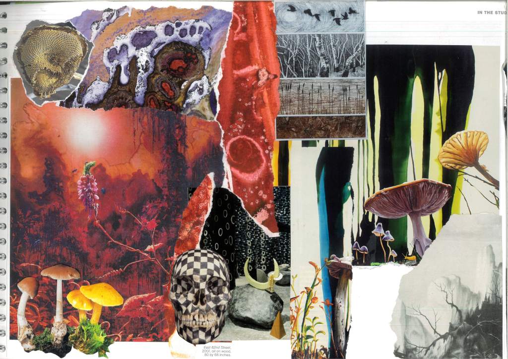 Liza Roos, In a Dark Wood 1/2, collage of found images and painted paper. Most of the collage above is taken up by images of Matthew Ronay’s installation Between the Worlds (2010). I added images of mushrooms from an old biology poster and some scrap bits of painted paper. The dark, burned wood reminds me of these recurring nightmares I had when I was young. Wild wolves hunting me through a pine forest with nowhere to hide, no low branches to climb up on, no escape. I never saw or heard the wolves, I just knew they were behind me and getting closer, like an evil presence. As a child I had visited this pine forest many times on family vacation, it was never daunting or scary on those sunny days. In my dreams the pine forest looked exactly the same, I felt I could even distinguish individual trees, except now it was dark and only a pale light lit the scenery.
