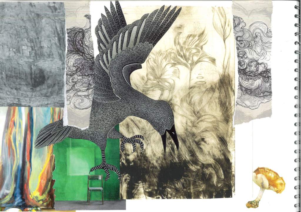 The image of the bird is from an old calendar with Inuit art. This particular image is Raven’s Dance by Kananginak Pootoogook. The green image and the grey squiggle drawing are from an art supply shop catalog and I have not been able to find out who created the work. There is another mushroom from a vintage poster. Behind these is a dry point etch I made together with a photo of an oil painting of abstract trees I made a few years back. I tried to make it look like the bird is coming in to take you away from your safe space, pluck you out of your chair and carry you off for an adventure.