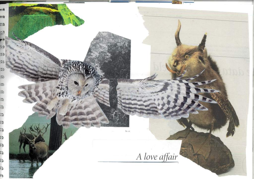Liza Roos, The Birds 2/2, collage of found images. On the other side are a group of images cut from old National Geographic magazines. I’m not sure what I meant with “A love affair” at the time. Perhaps a love affair with nature? Or a dreaming of living in nature?
