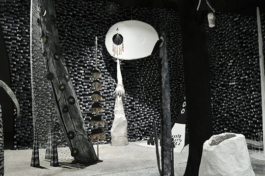 From the original Press Release about The Due Return: “Once a seafaring vessel, [The Due Return] now bears the marks of its previous voyages, a hodgepodge of transport devices and retro-fitted technologies. The ship’s interior speaks of its rich history and its passengers. It is a history that is discoverable through a vast fictional archive presented throughout the ship. The foreign environment that the ship resides in is filled with alien flora, fauna, and fungi; glowing trees that interact with audience members, cliff dwellings sprouting mysterious fruits, and creatures that sing alien tunes. The project incorporates video, live performance and extensive interactive elements, to submerge the audience into a fully-operating fictional world.” (Visual Arts Source)