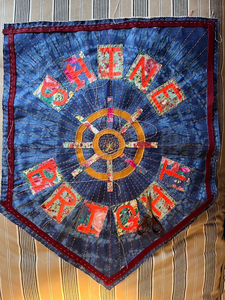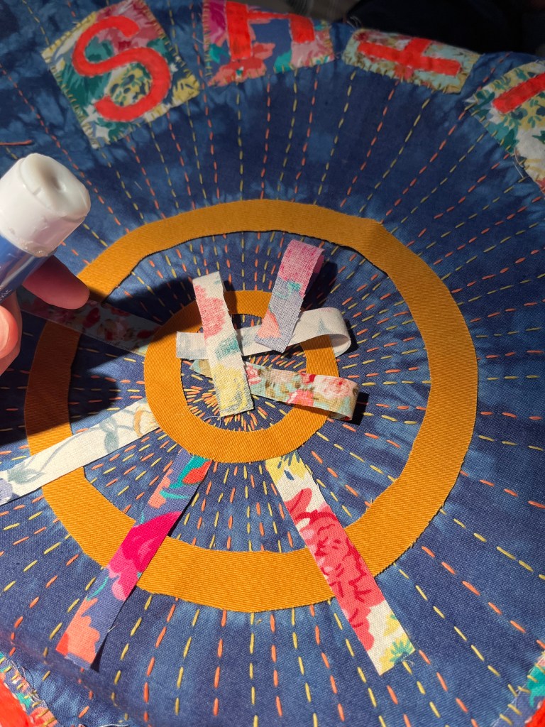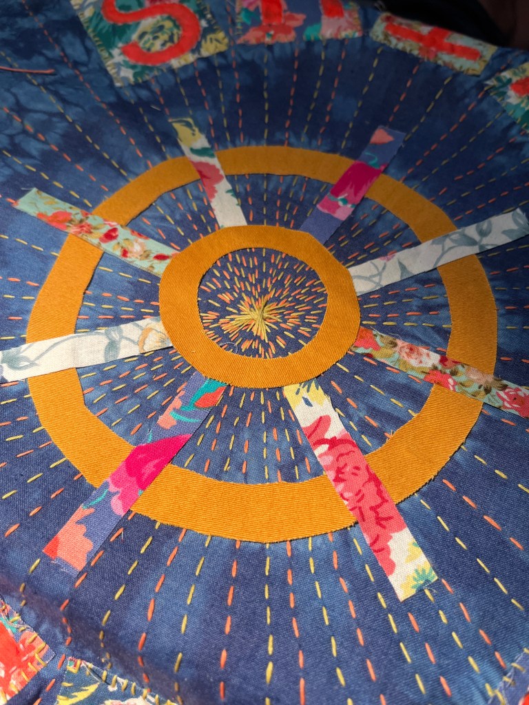 my scraps I was able to complete all the petals and made a start attaching the rosette to the backing fabric before the end of the workshop, I worked as fast as I could! Unfortunately, I made my centre piece too small. When I got home I had a piece for grey fabric left and made a centre piece with it, but I hate the look of it, the colour is wrong and so is its size. I don’t have large enough fabric pieces left, so I’ll have to piece some bits together, perhaps I can arrange them in a radial manner and that’ll go well with the rosette.