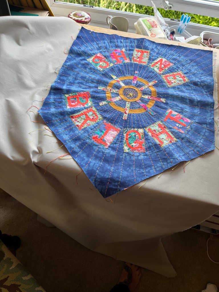 I booked the Dresden Delight workshop. I have made quilts before, but nothing as intricate looking as this and I thought this could be a technique I can use in my own work or it would at least look really cool on the back of a denim jacket. Everything you needed was provided and I was so pleased seeing the fabrics! I learned a lot during this workshop besides making the Dresden Delight; especially how to do Inside-Out Appliqué (were you sew your piece right sides to a backing and then turn it out before pressing and attaching it) and chain sewing (were instead of cutting your thread each time after sewing a piece, you just keep going, feeding the next piece through).