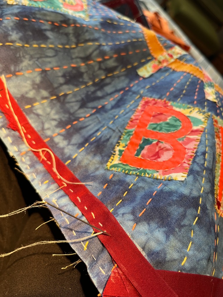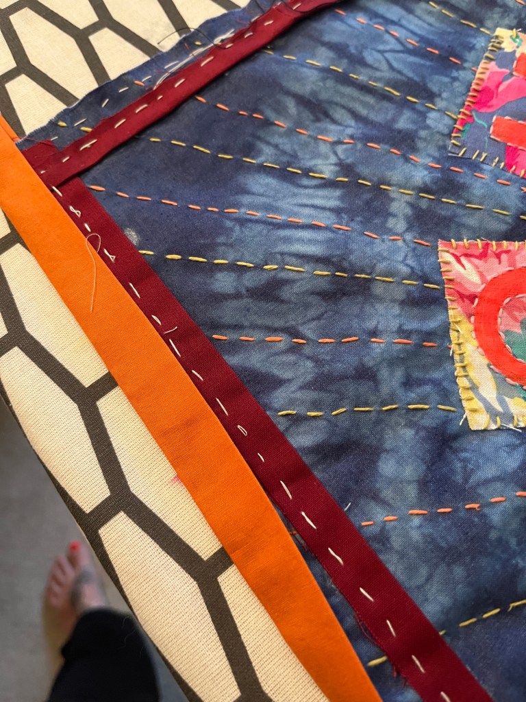 On my way home I continued my slow stitching and admiring my farbic scrap haul I added more bits and more stitches. I continued adding layers of stitches, mostly running stitch and blanket stitch in a rnage of orange and blue DMC embroidery thread (most split in 2-3 strands).