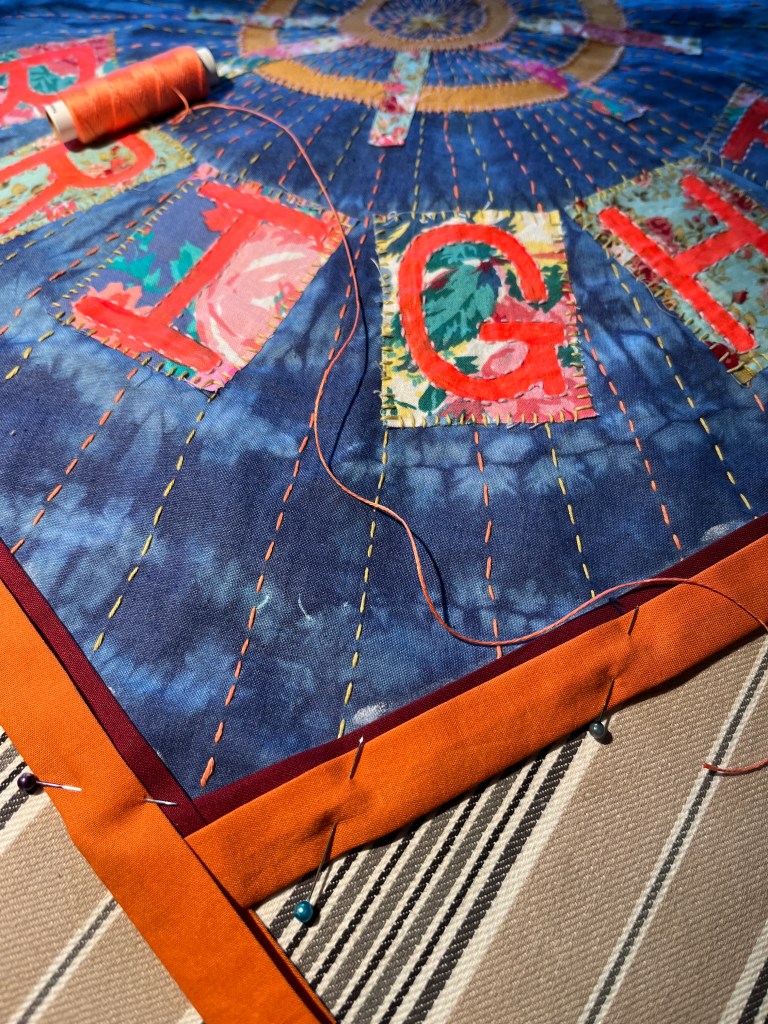Then later in the year, I went to the Knit + Stitch Show in London. In an effort not to be on my phone for the whole journey, I brought a little pouch with some thread and bits of fabric. It was meditative to slowly stitch while the world went by, listening to music and seeing where the thread would take me. What started as a few simple running stitches, turned into a complex net of layered blanket stitched I now title “Cast Your Net Wide”.