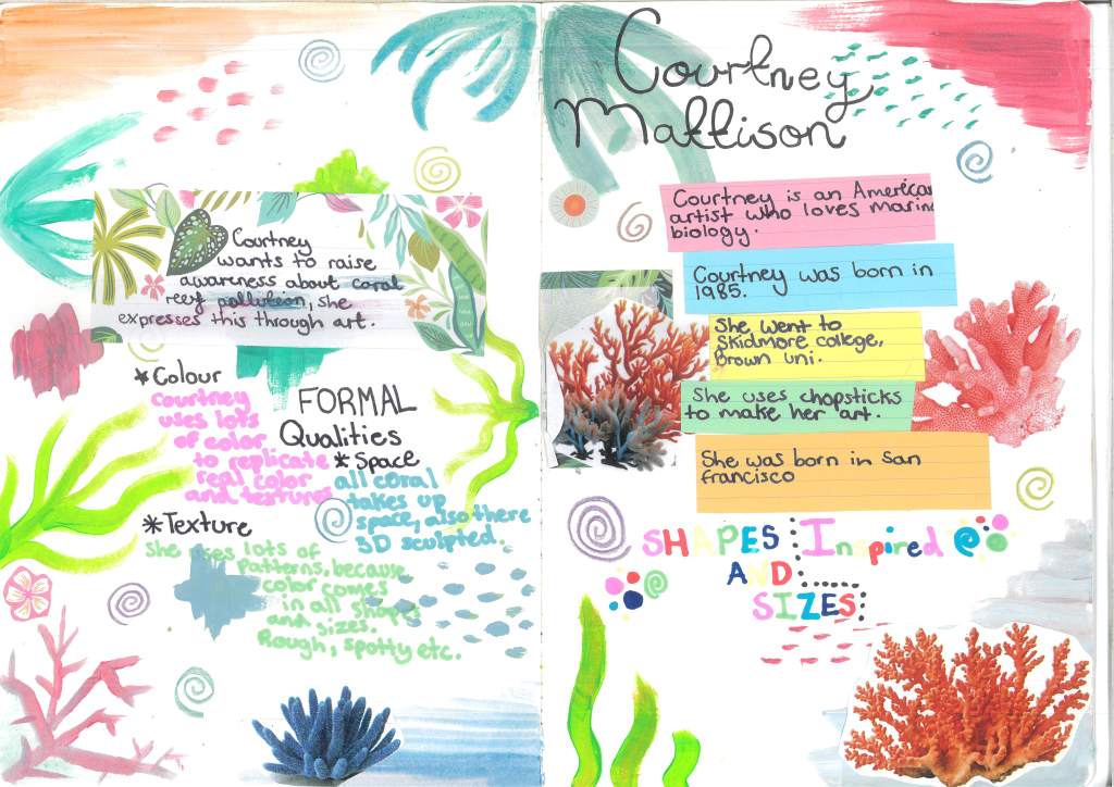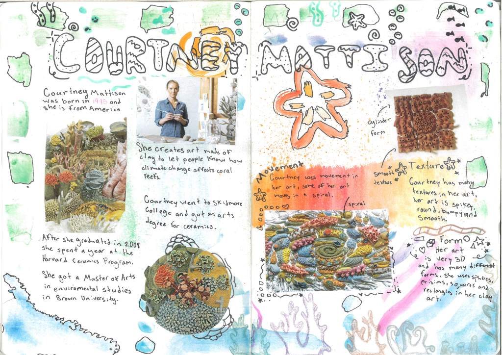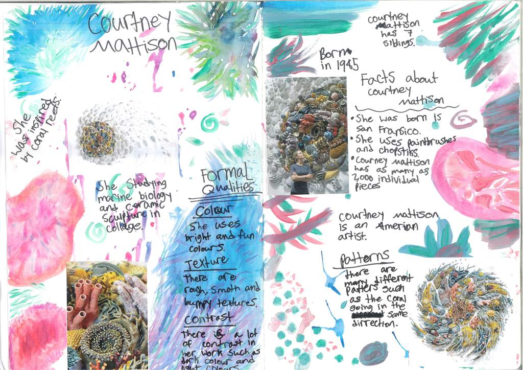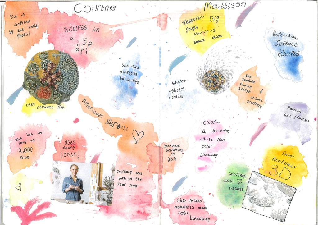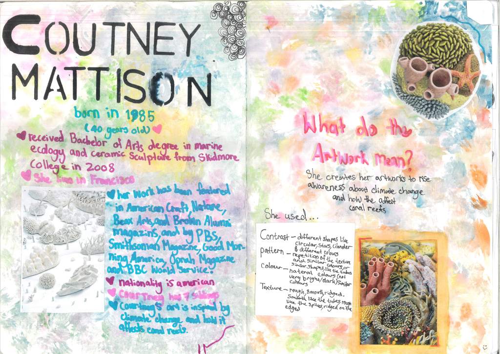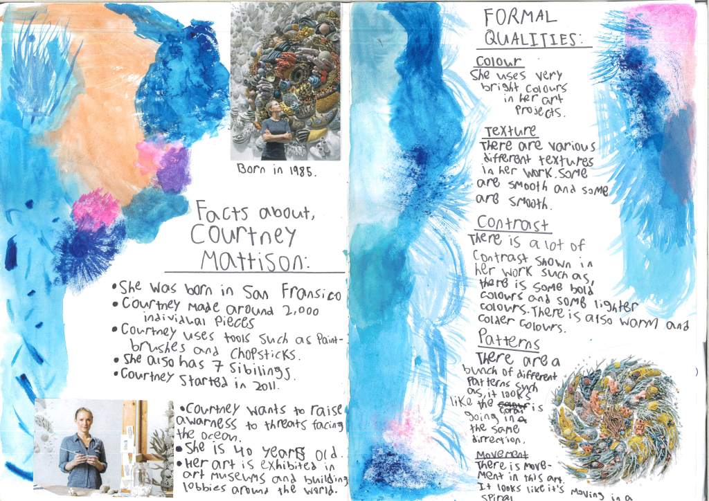 After the colour theory and texture exercises, students will create a page spread about the work of Courtney Mattison. In a class discussion we go through the formal qualities and how different artists use them to create their work. I start them off with paintings as this is something they’ve practiced before, then we look at sculptures.