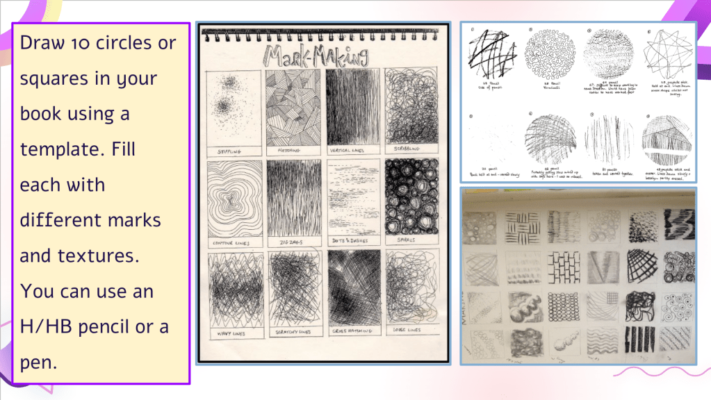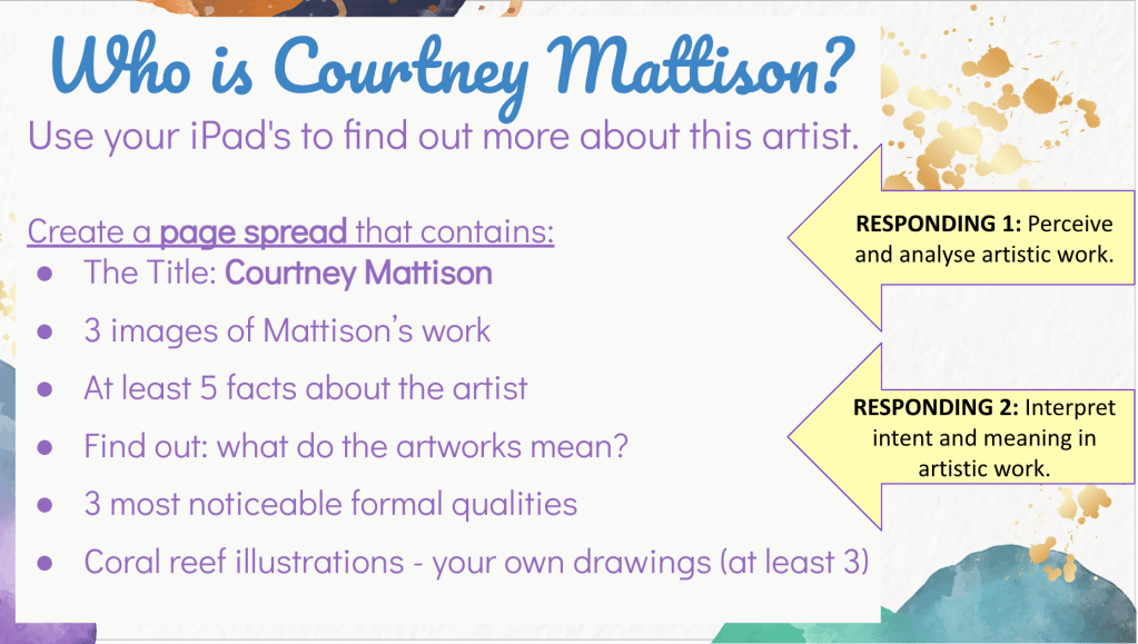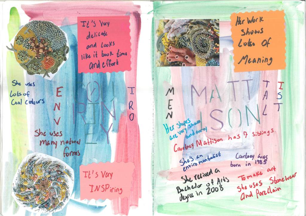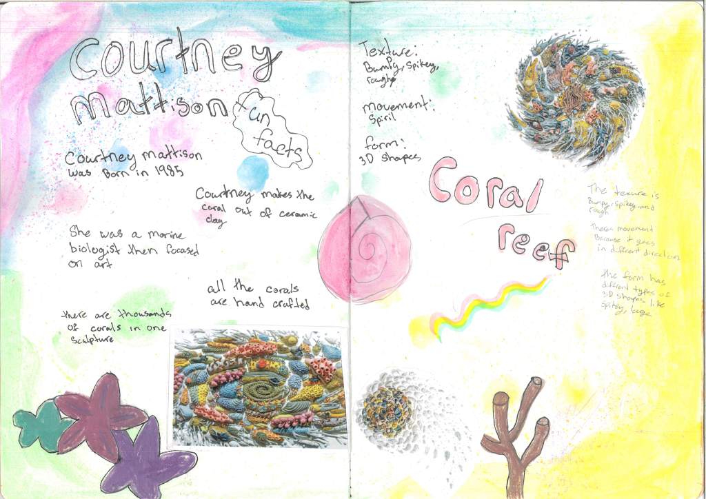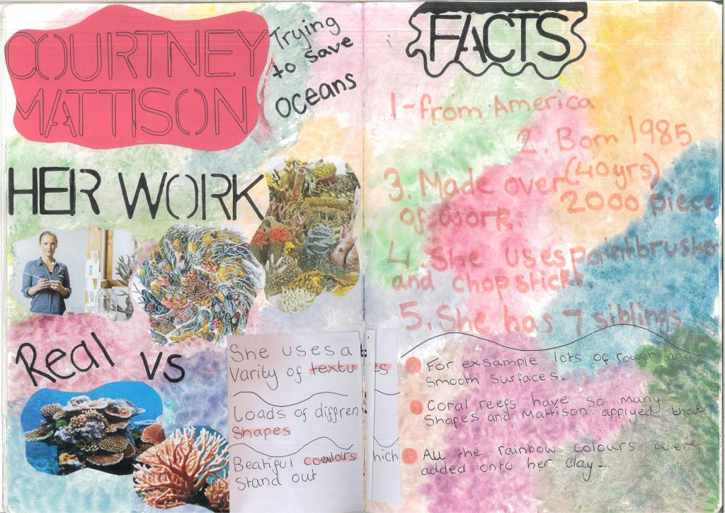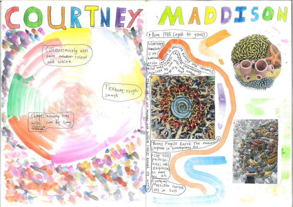 After the colour theory and texture exercises, students will create a page spread about the work of Courtney Mattison. In a class discussion we go through the formal qualities and how different artists use them to create their work. I start them off with paintings as this is something they’ve practiced before, then we look at sculptures.