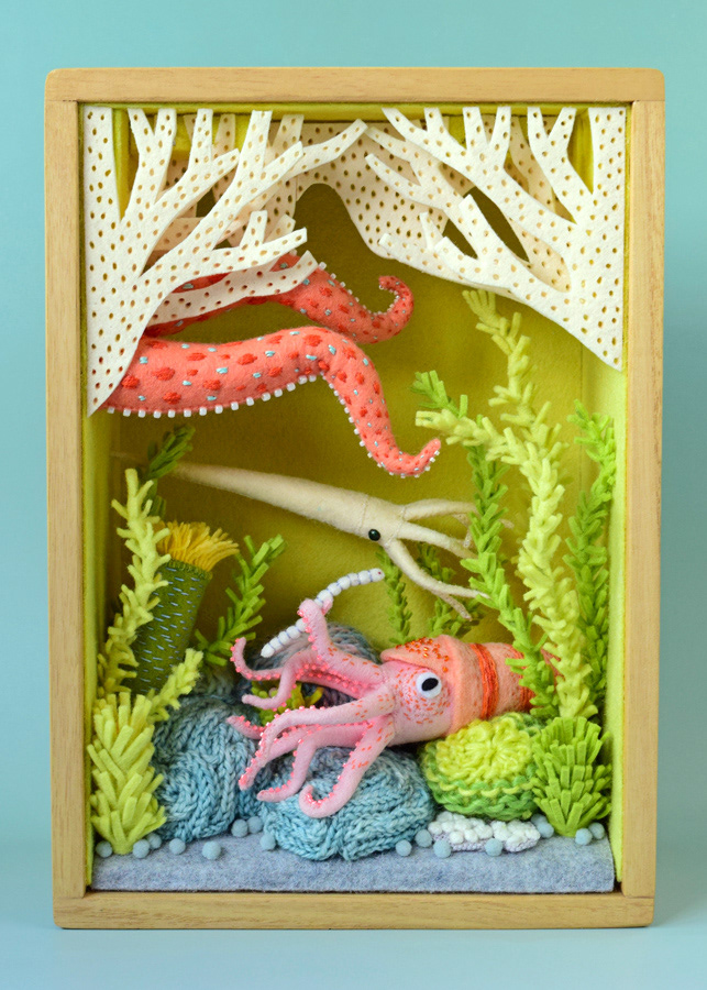 We also had a look at the photographs of David Doubilet, especially this series Two Worlds, the photographs of Frederic Demeuse, his series of Hidden Places is fantastic, Hiné Mizushima‘s felted sea creatures and Lisa Ericson‘s coral transformation paintings.