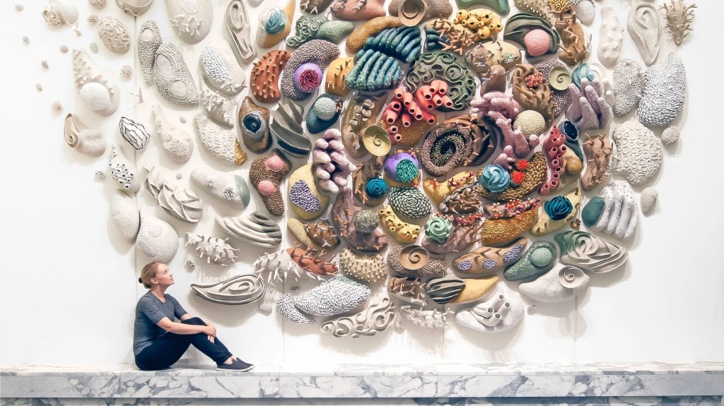 Some questions I ask to prompt conversation: David Doubilet: What is the relationship between humans and nature (coral reefs/the ocean)? Frederic Demeuse: Can we see similarities between the forest and coral reefs? Hiné Mizushima: What forms and textures has the artist used to create interest? Lisa Ericson: How are the animals and the ocean connected?