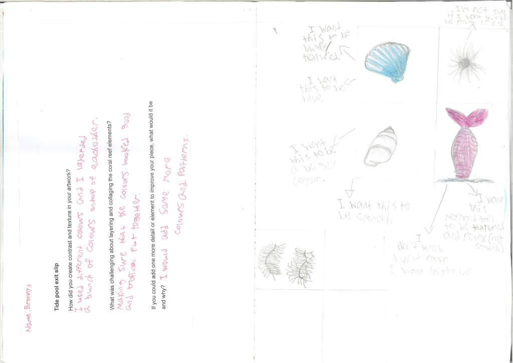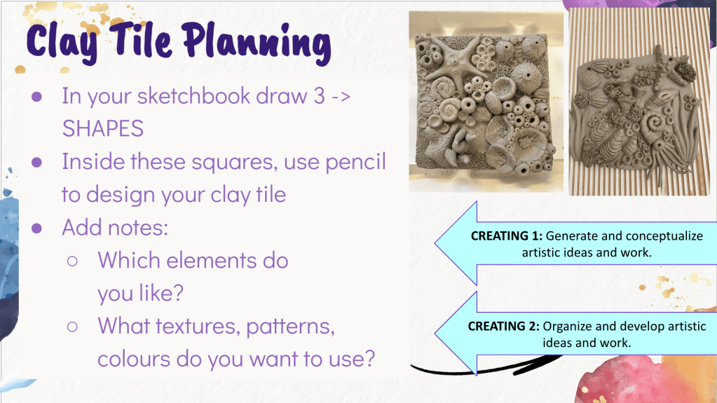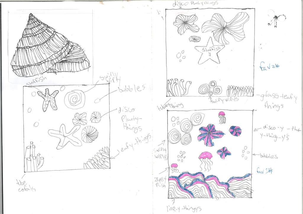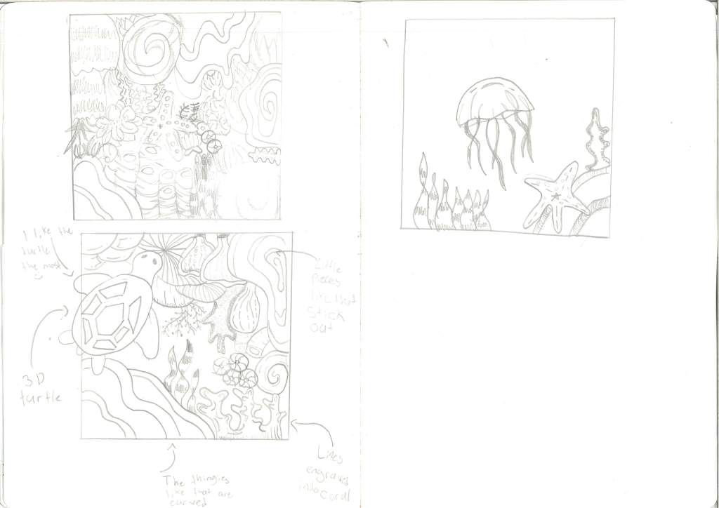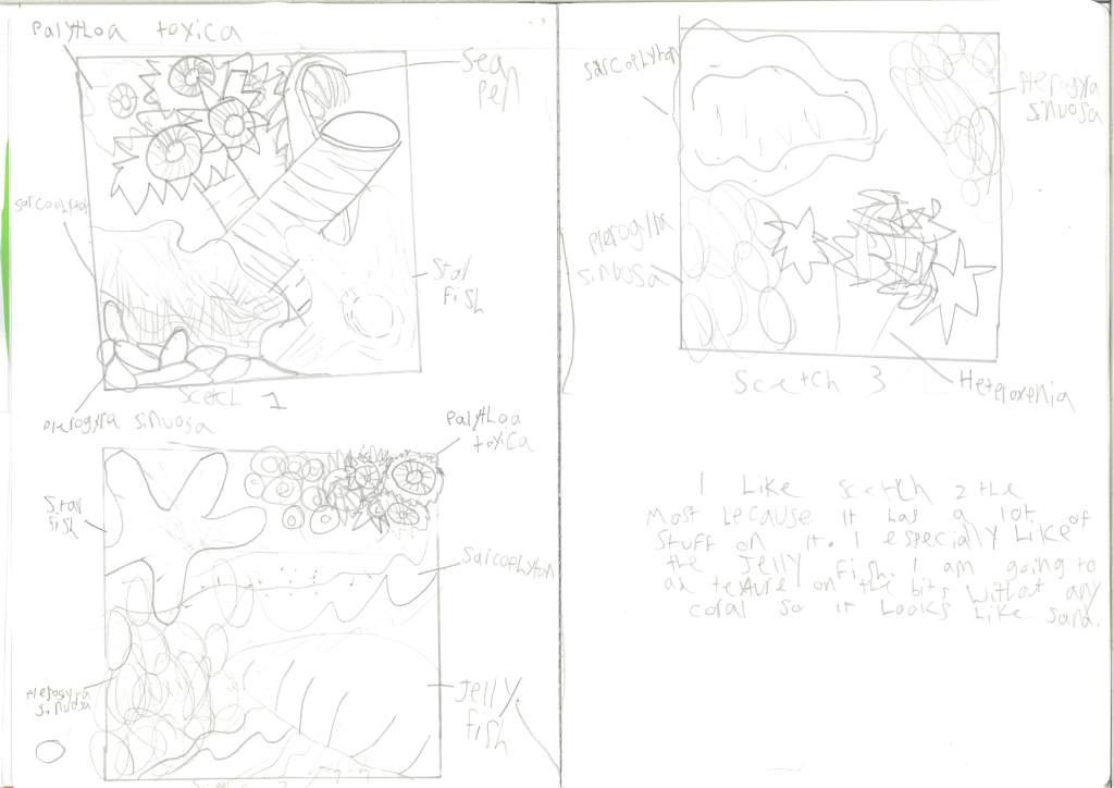 Before starting their ceramic tiles, they made several sketches to plan their work. We discussed how, while working, their plans would likely change but that thinking before starting would still help them in their final piece because it would prevent them from rushing into their work blind. I also gave them handouts with images of different reef formations so they could name the different parts in their plans.