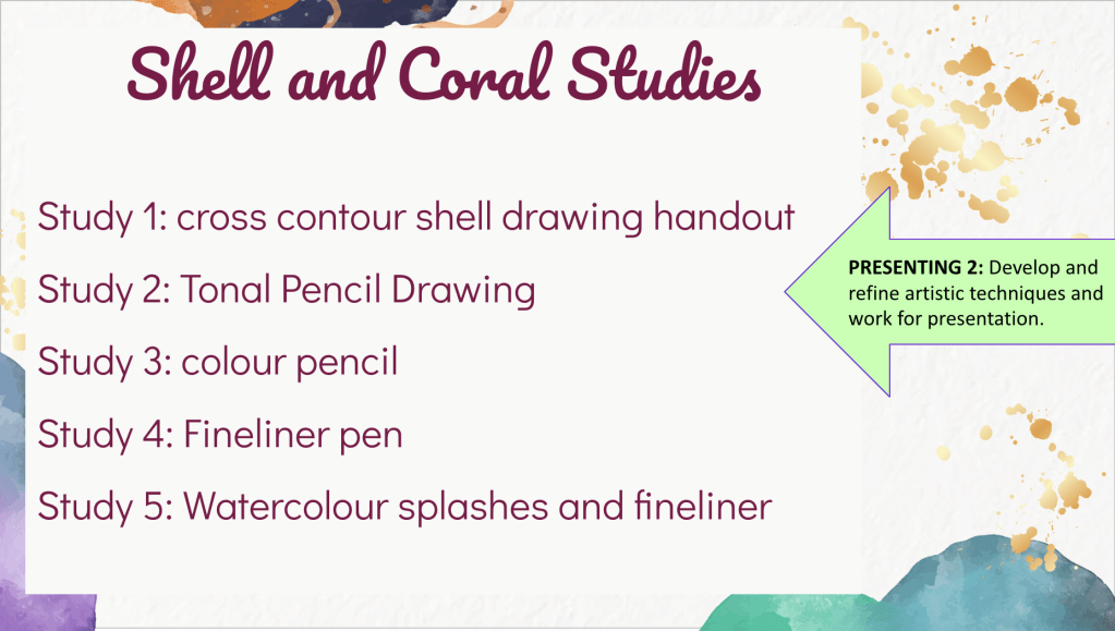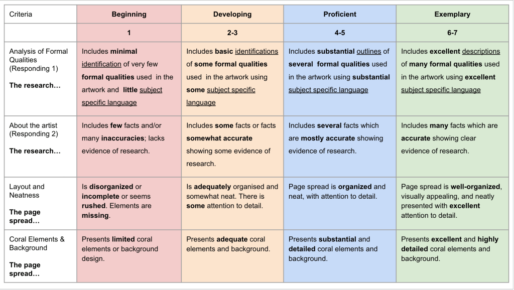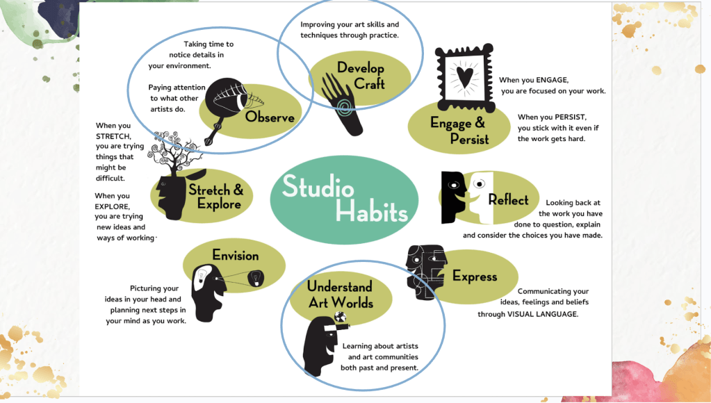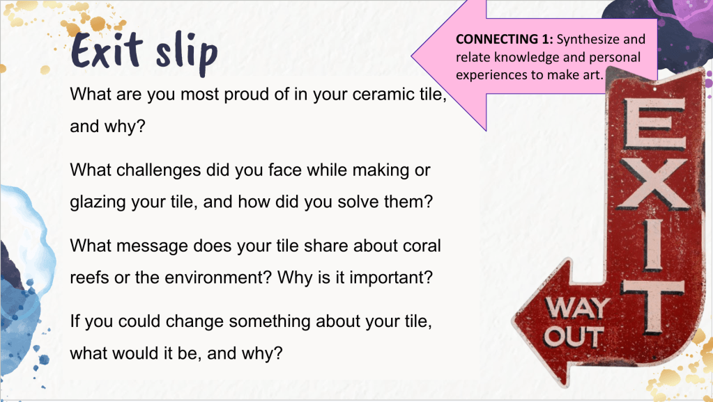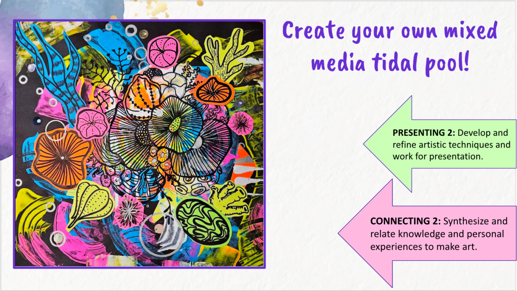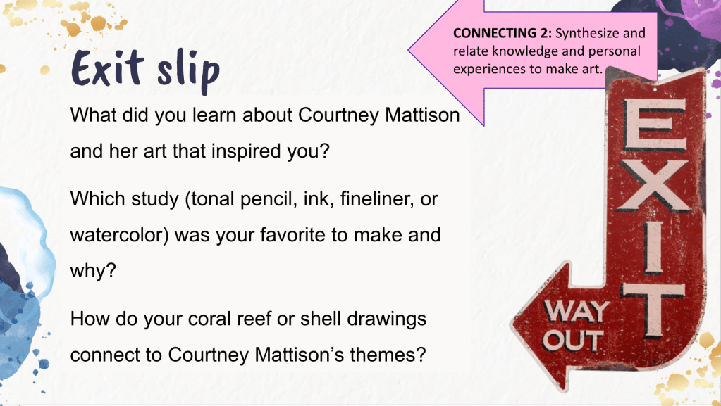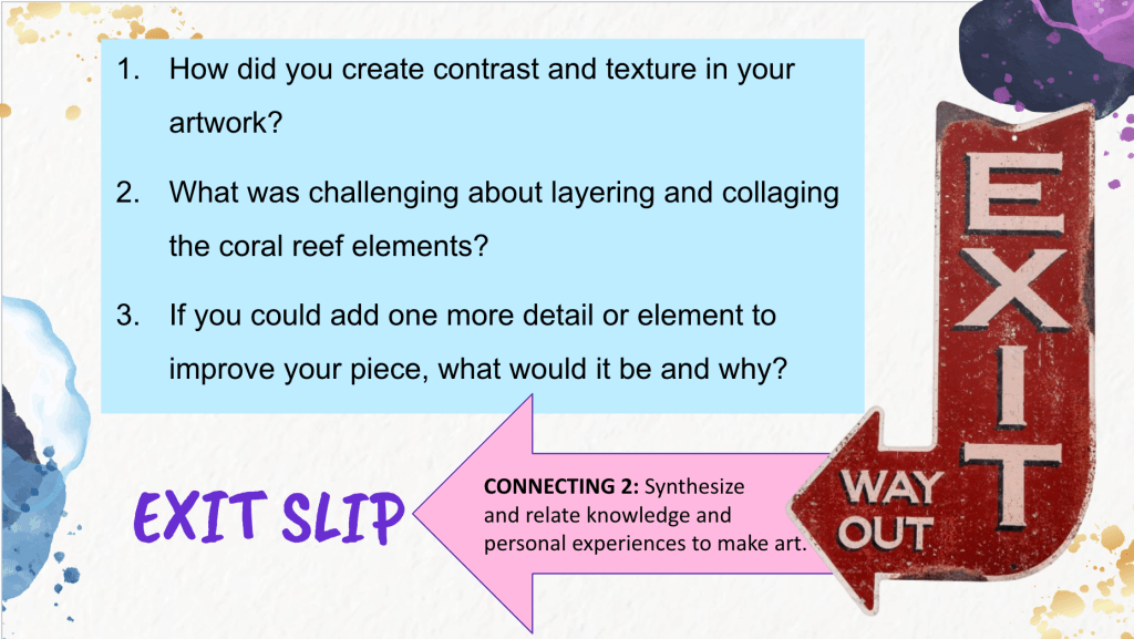 From there I introduce the unit and explain that we will create our own coral reef, or perhaps a different biome, but that we’ll first review some of the formal qualities so that we’ll be ready to apply them in our own work. We discuss the standards assessed during this unit and which Studio Habit of Mind we will practice during the unit.