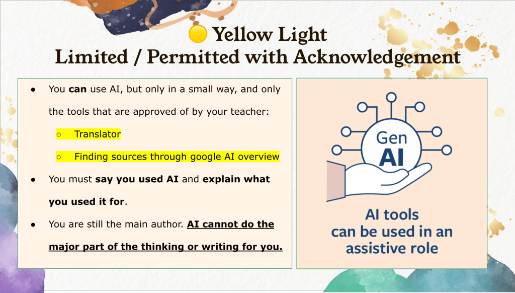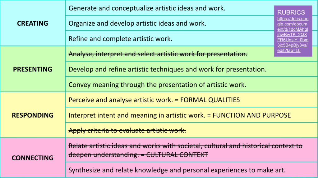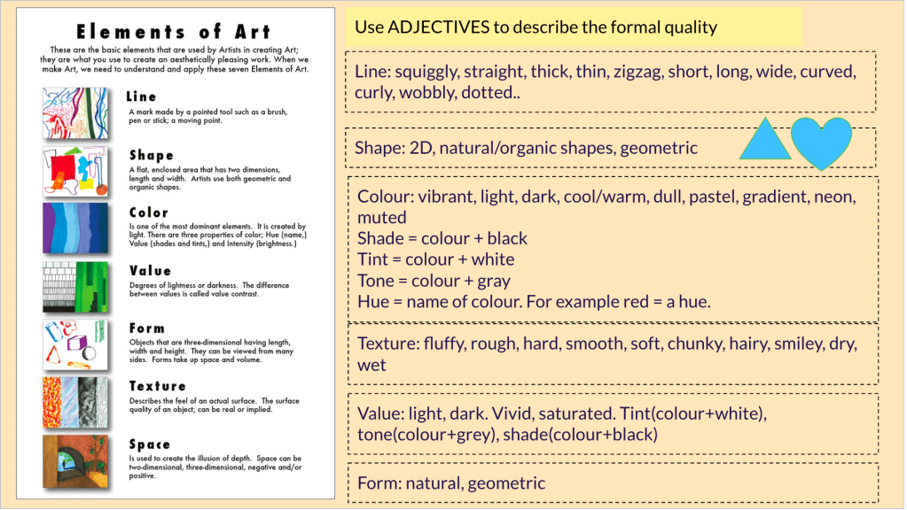 Together, we come up with different adjectives to describe the different formal qualities, discuss the assessment criteria, the task and how they may use AI.