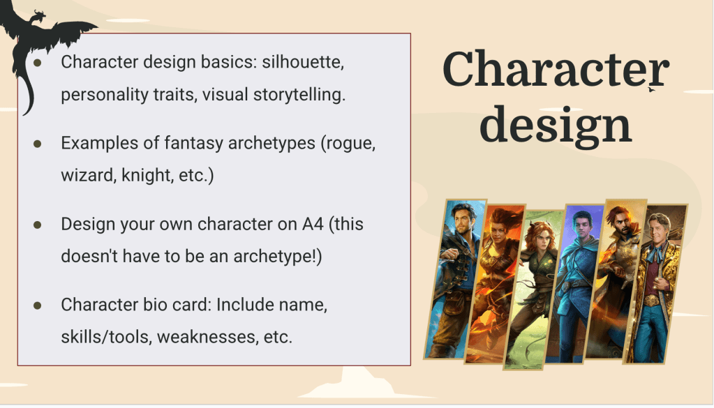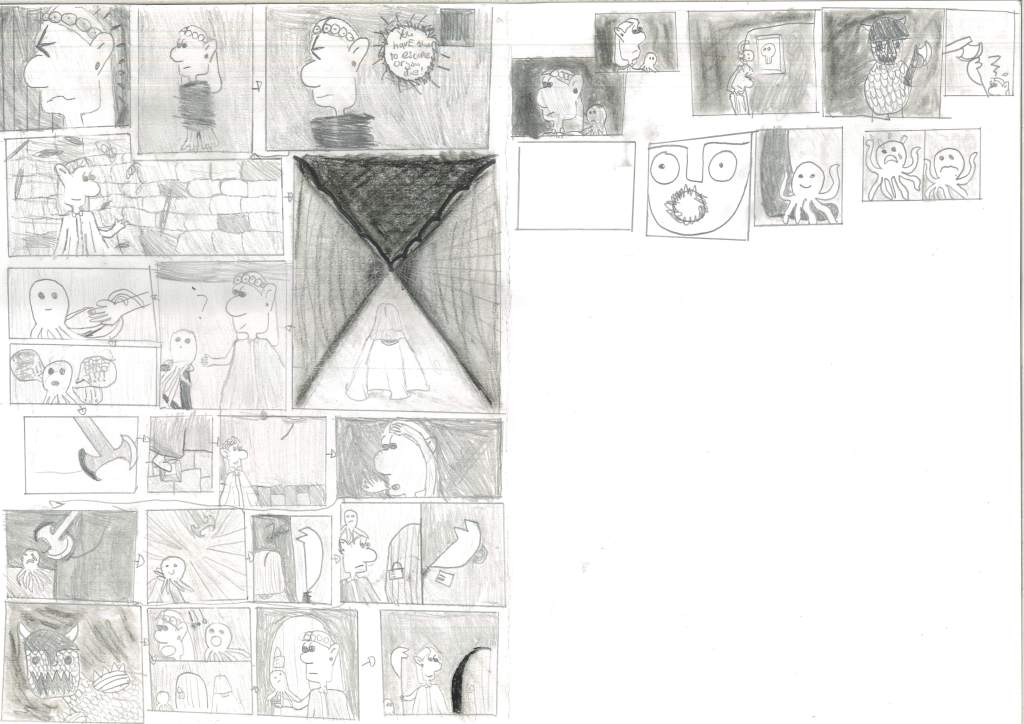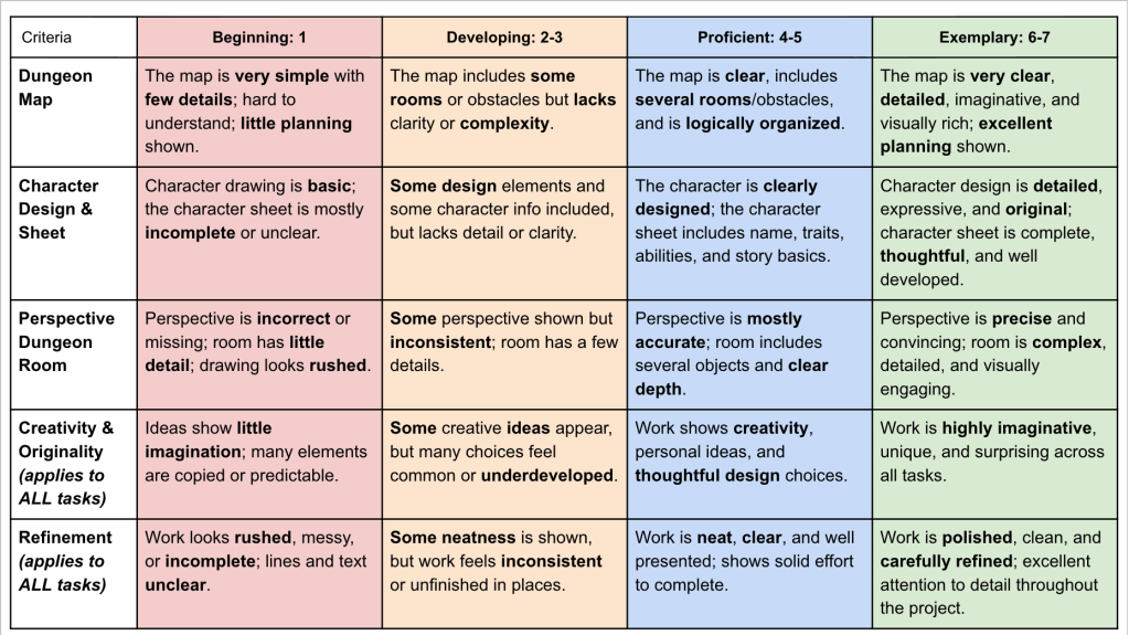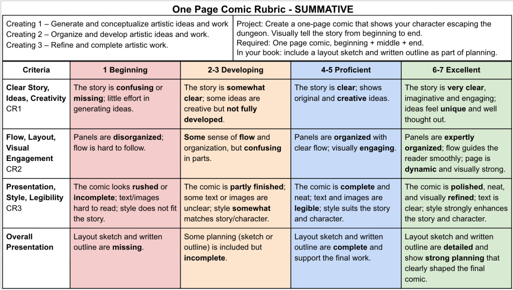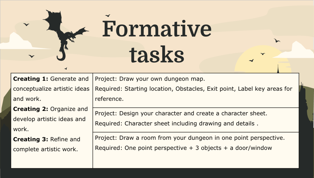 Throughout the unit I have planned for differentiation, for example by giving the option for one point perspective grids, lists of dungeon ideas, printable comic layouts. Students are also free to choose which media they prefer (pencil, pen, colour pencil, water colour, even collage!) considering the mood of their work. They may also choose to create more abstract or stylised characters, the practice here is to imbue the character with expression and movement to aid story telling.