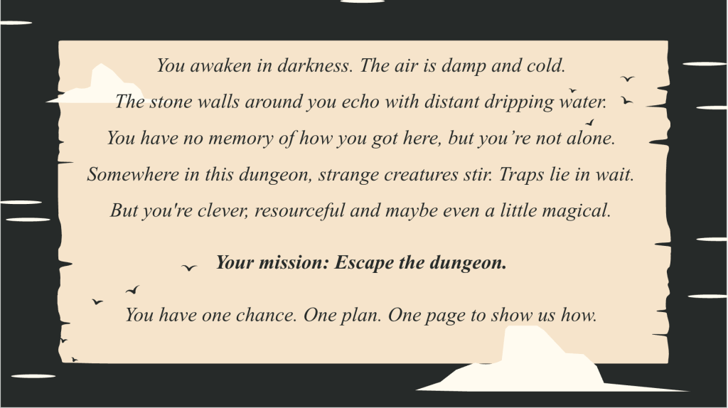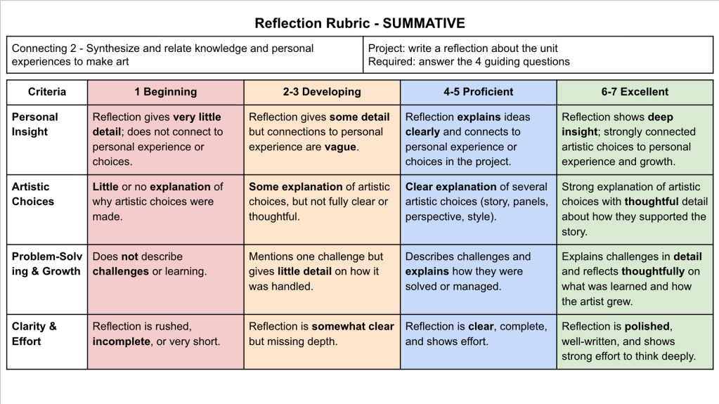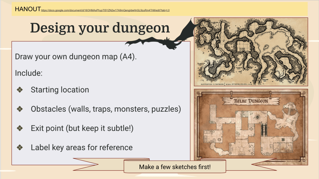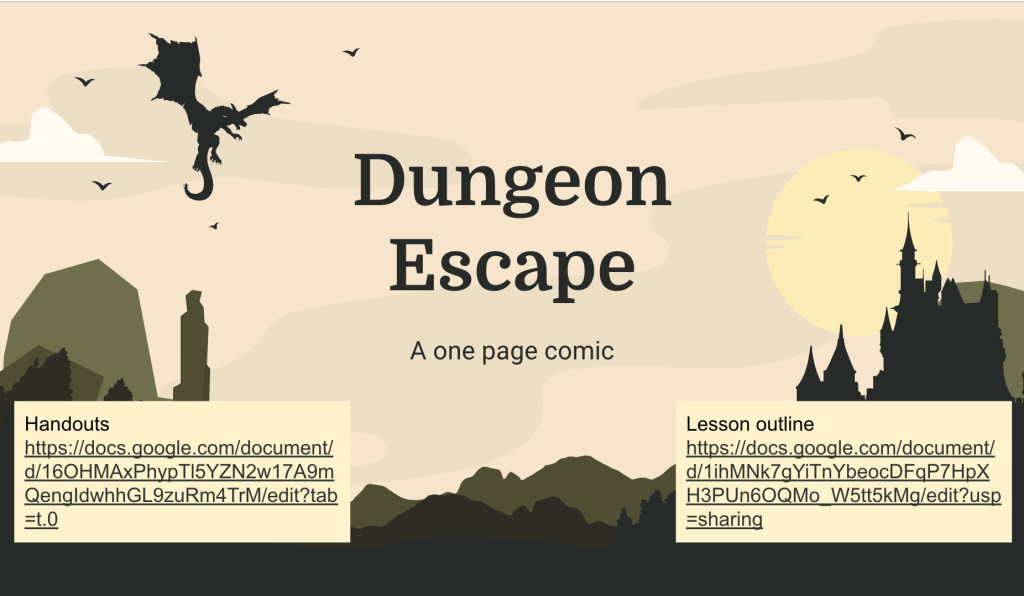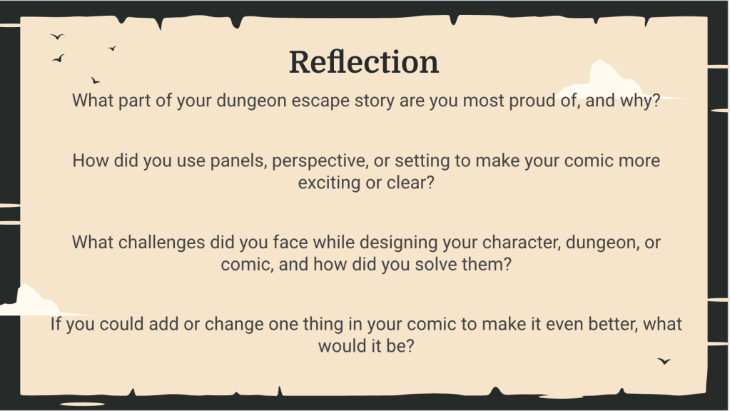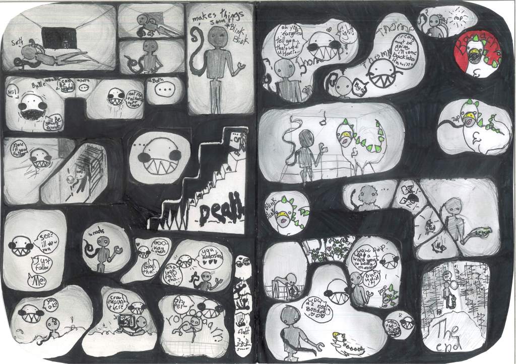 Throughout the unit I have planned for differentiation, for example by giving the option for one point perspective grids, lists of dungeon ideas, printable comic layouts. Students are also free to choose which media they prefer (pencil, pen, colour pencil, water colour, even collage!) considering the mood of their work. They may also choose to create more abstract or stylised characters, the practice here is to imbue the character with expression and movement to aid story telling.