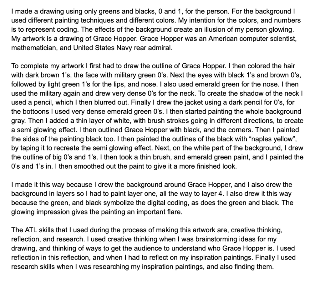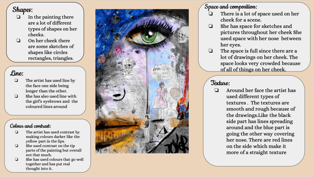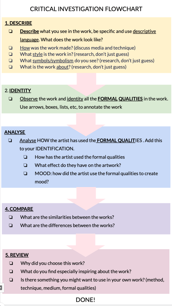 Some EAL learners find it easier to write in their preferred language first and then translate it using a dictionary or translation tool. For this criteria I am looking for the student’s understanding and careful observation of the works and formal qualities, in which ever format or language might work best for the student.