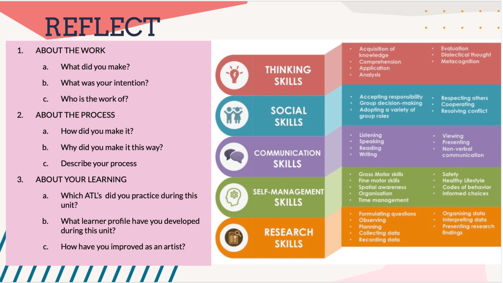 I start each lesson with a provocation, this can be a video, an artwork, a question, a newspaper article, etc. Sometimes I change the provocation depending on student inquiry and what might be current.
