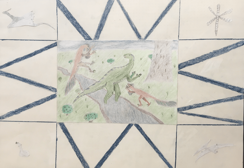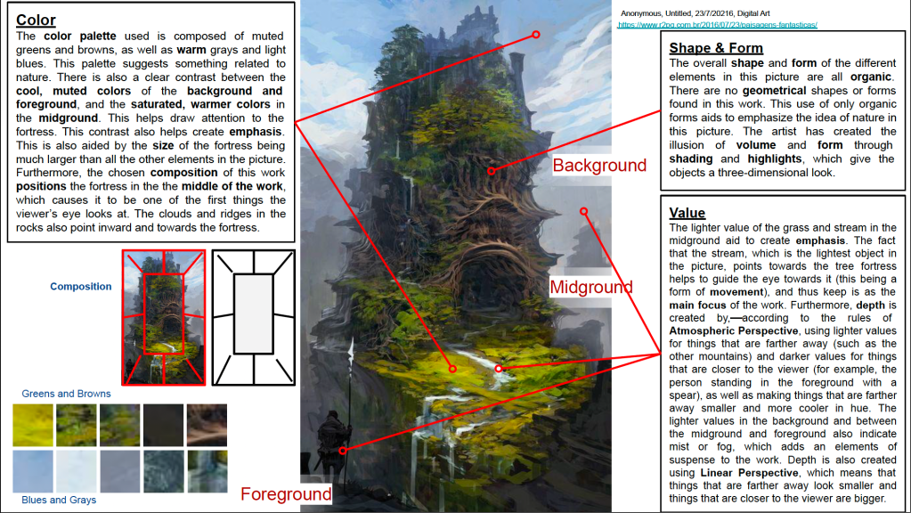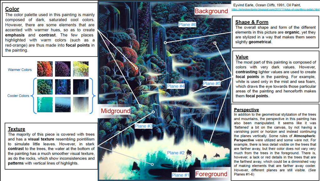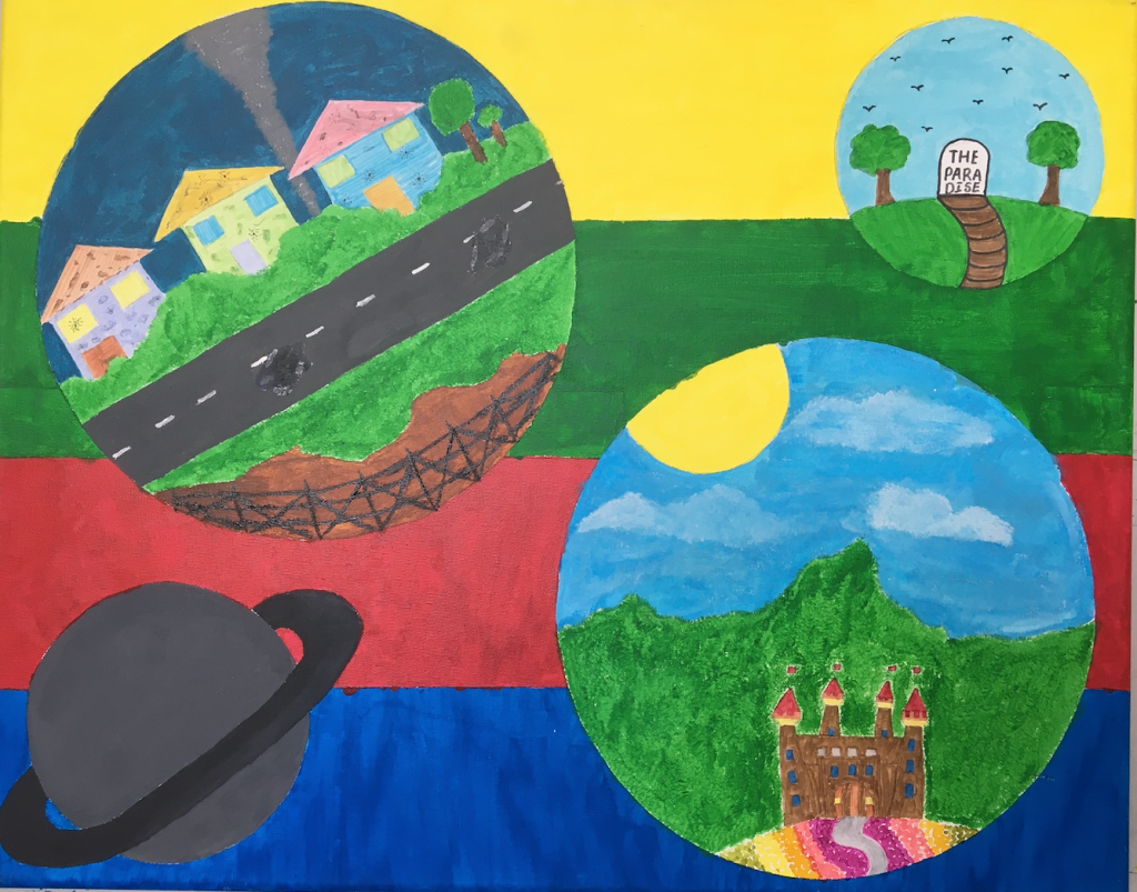 Then students devise a concept for their world including a mind-map exploring their planet, several composition sketches, media explorations, exploration into other artists, and a clear outline of intentions.