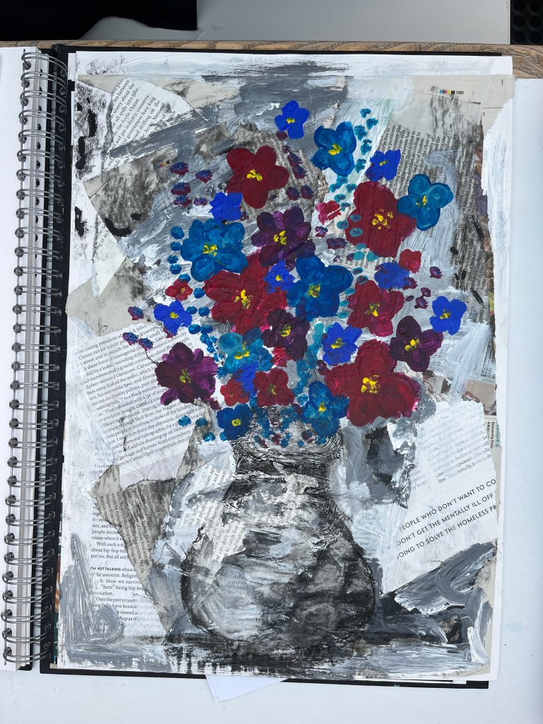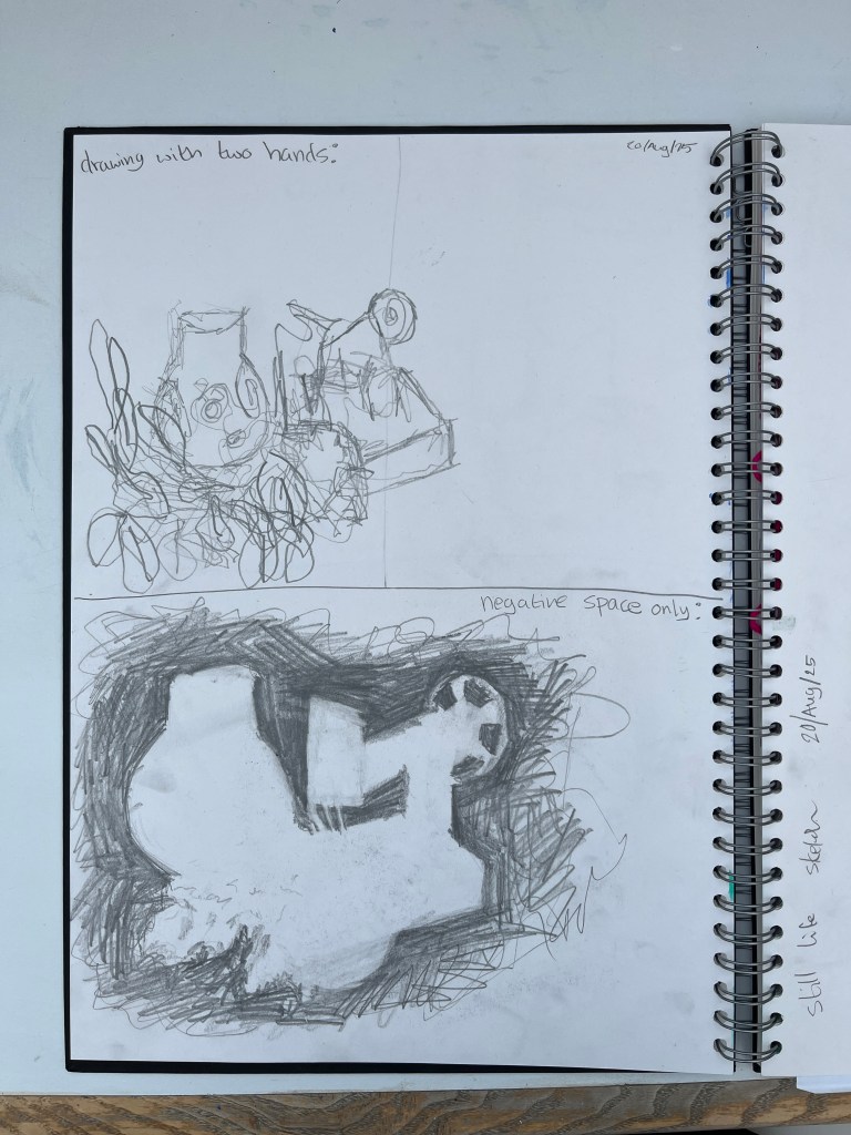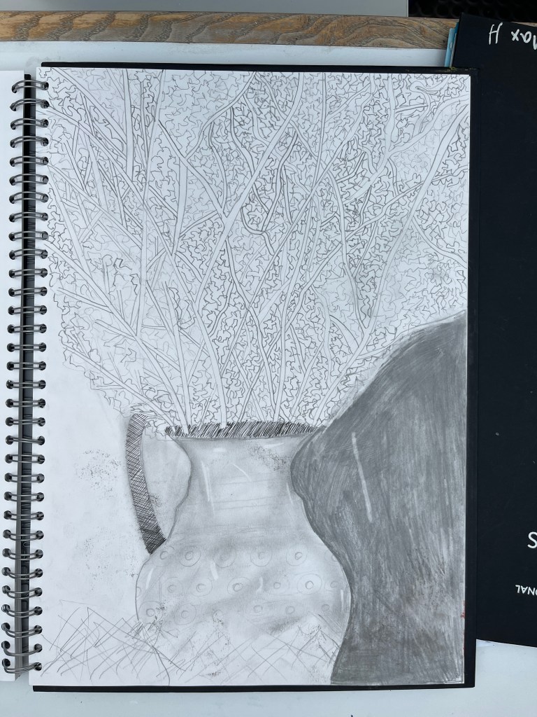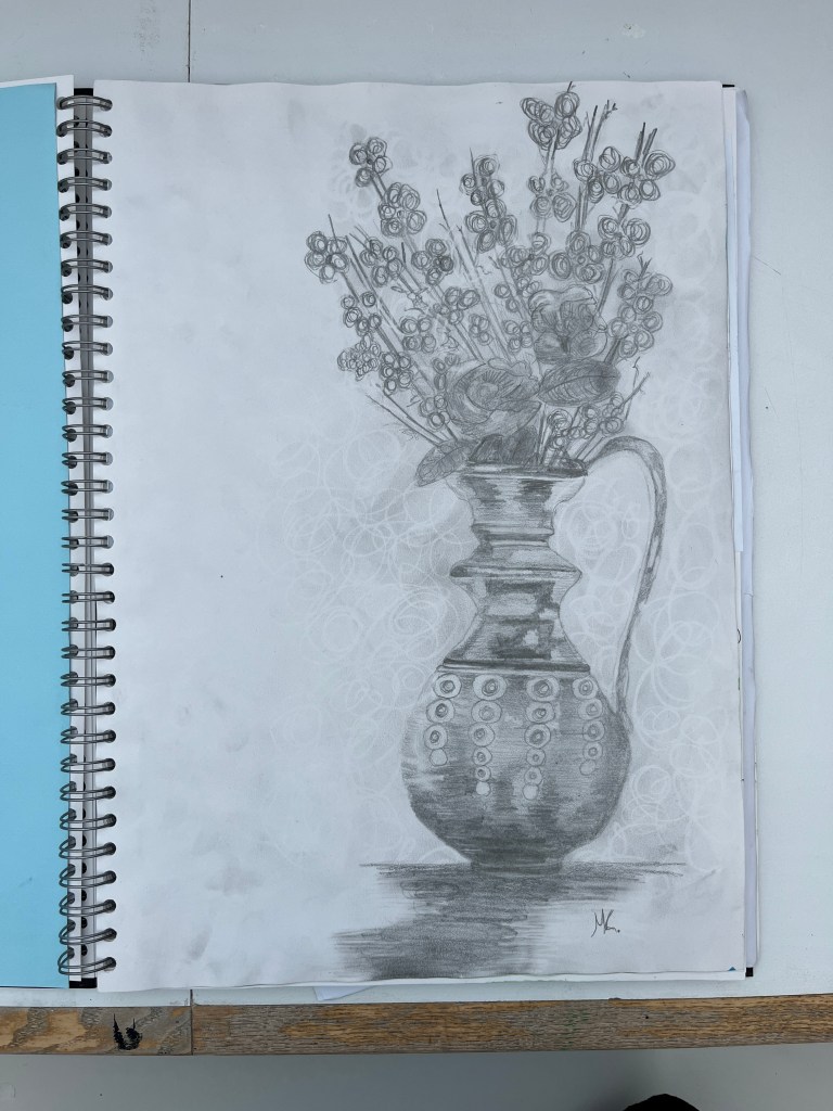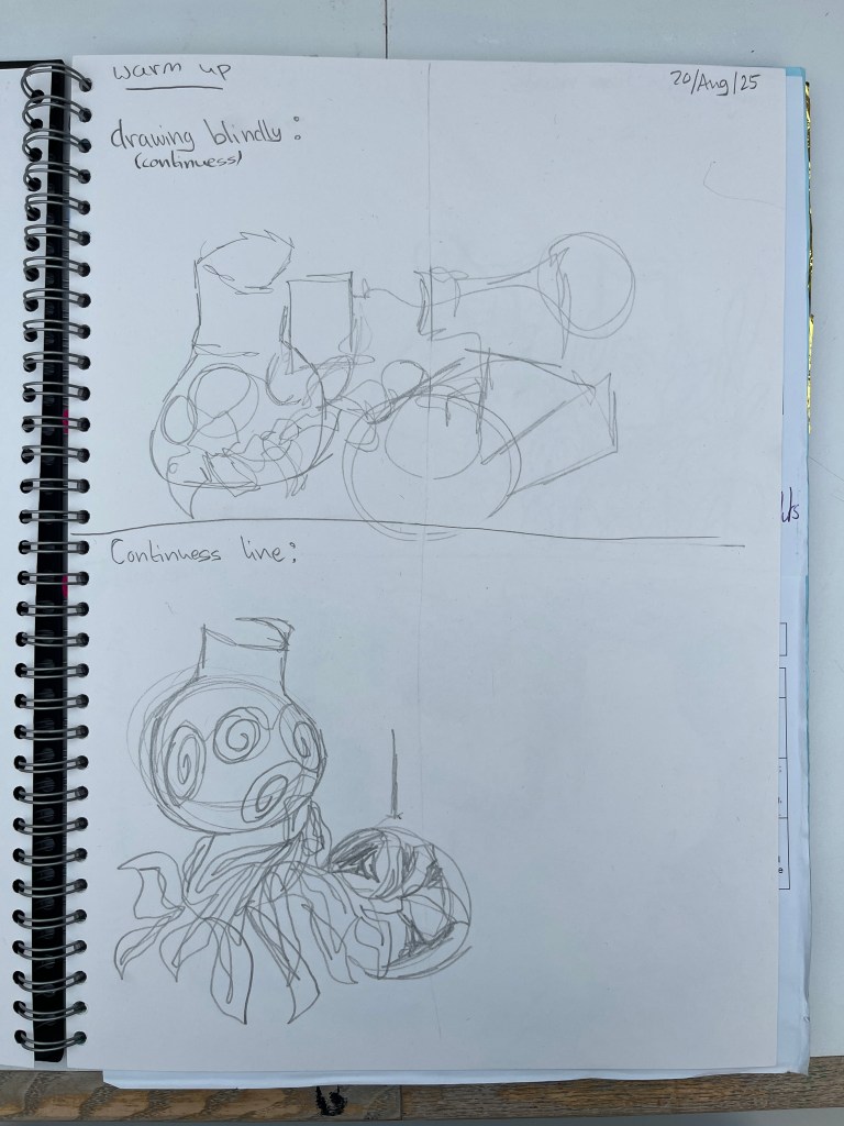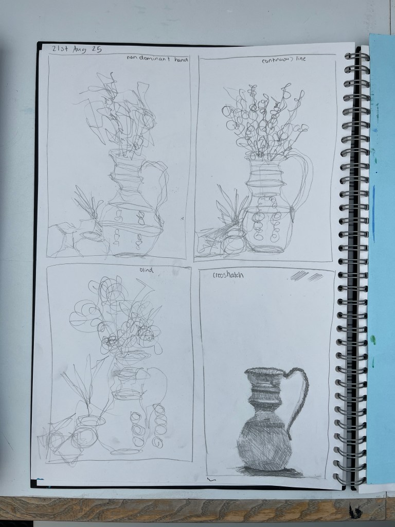 The first part of the unit is developing drawing and observational skills. We start each lesson with small timed warm up exercises such as blind drawing, continuous line drawings and value sketches. From there students create larger observational works such as still life collages and drawings focussed on different formal qualities such as value and pattern.