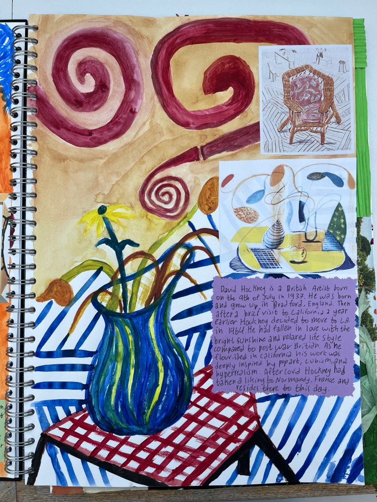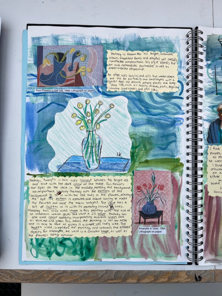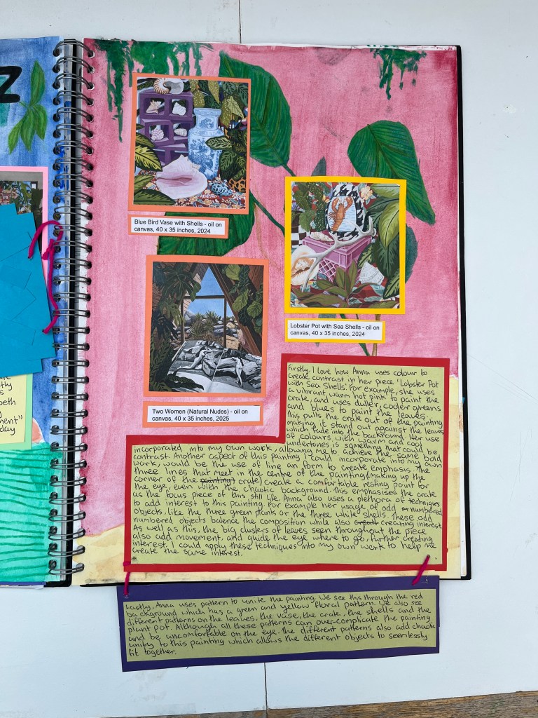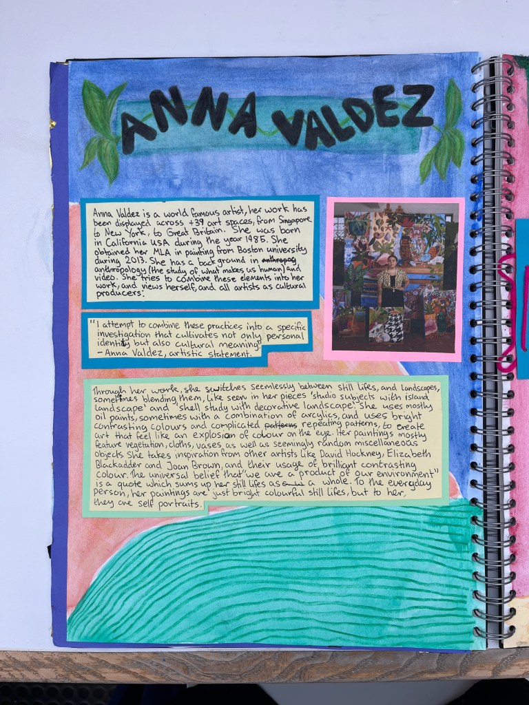 As part of their preparatory work, students investigate an artist and their work. I suggested Njideka Akunyili Crosby, David Hockney, Anna Valdez or Nicole Dyer, but students are free to choose their own artist as long as part of their practice they create still lifes. For the investigation students create a page spread including a formal analysis of one artwork, a brief bio and introduction and studies of two artworks or details of one artwork.