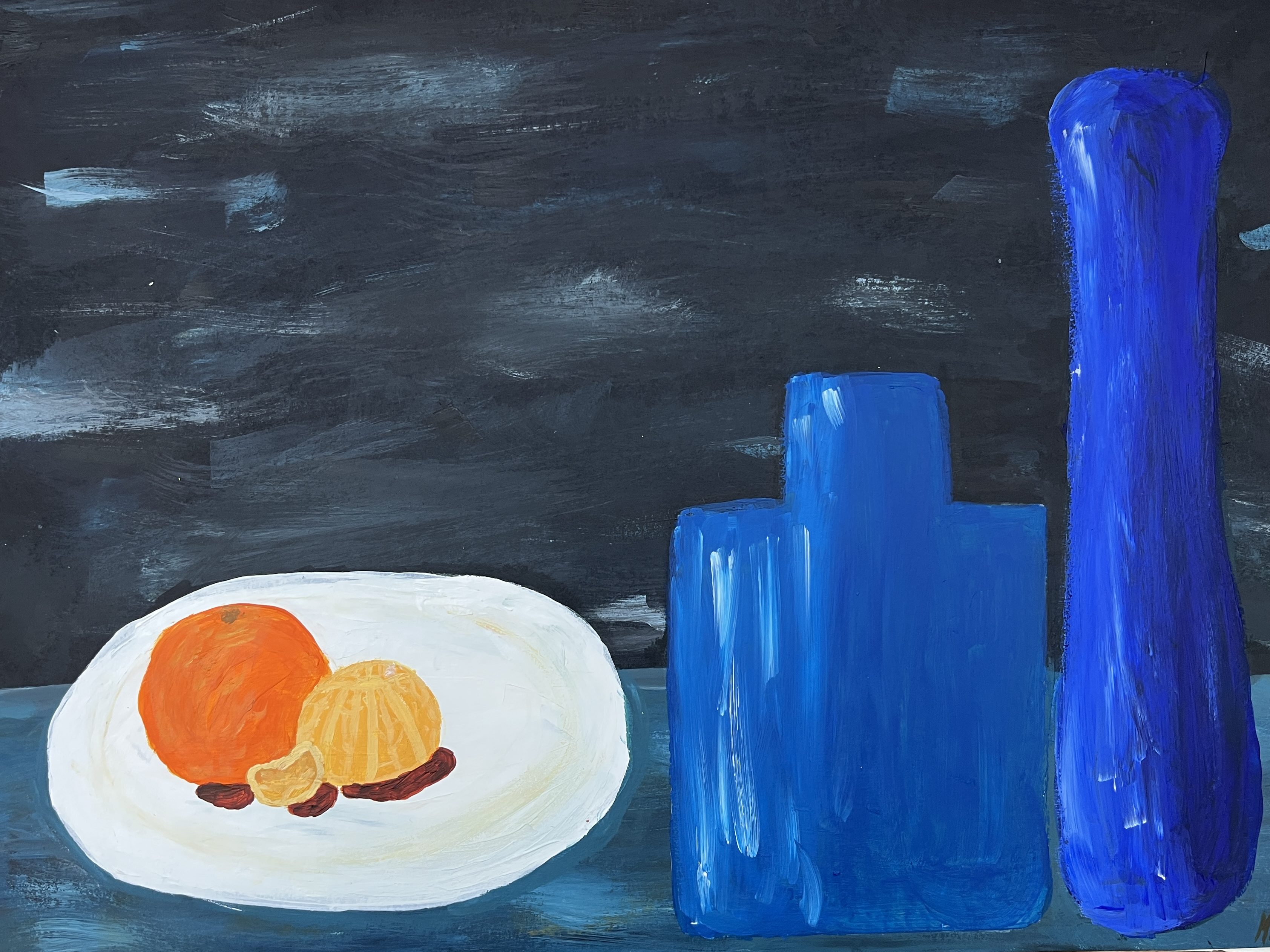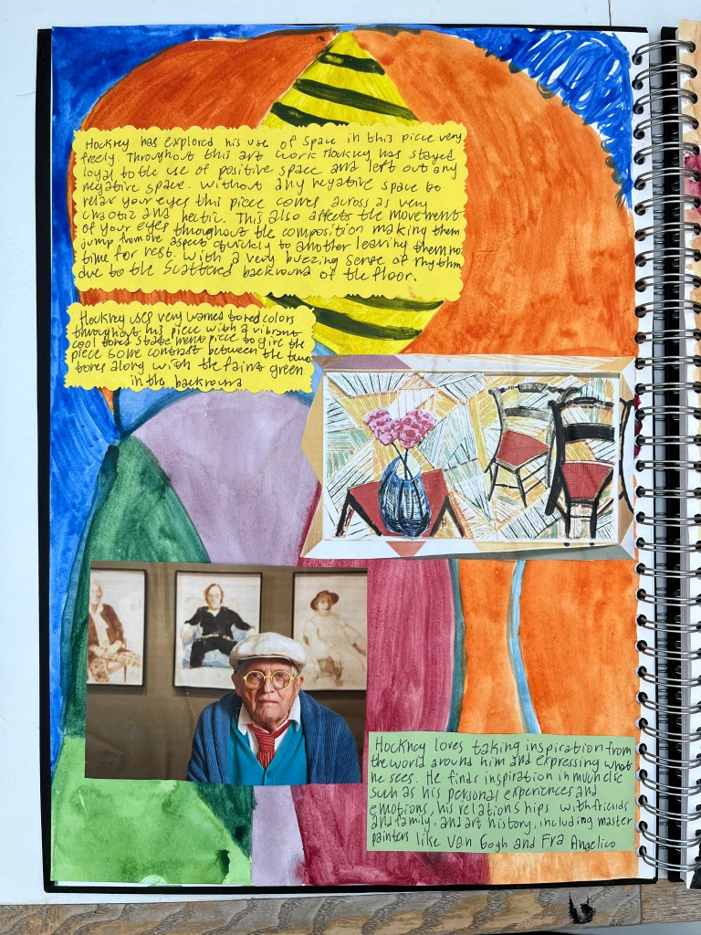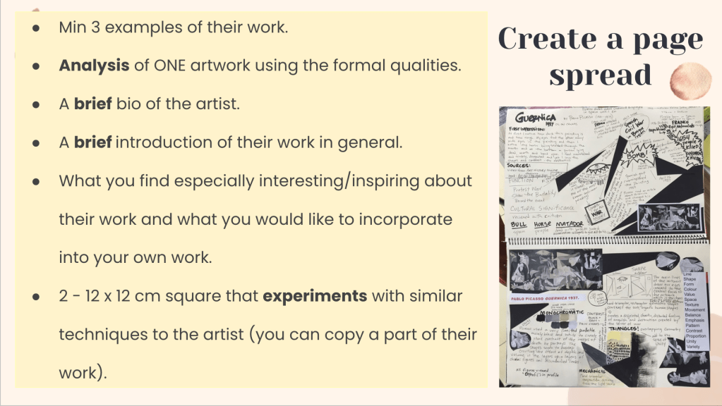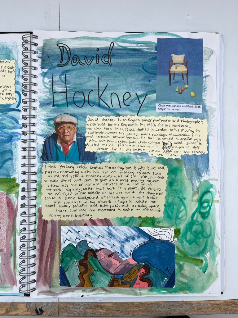 As part of their preparatory work, students investigate an artist and their work. I suggested Njideka Akunyili Crosby, David Hockney, Anna Valdez or Nicole Dyer, but students are free to choose their own artist as long as part of their practice they create still lifes. For the investigation students create a page spread including a formal analysis of one artwork, a brief bio and introduction and studies of two artworks or details of one artwork.